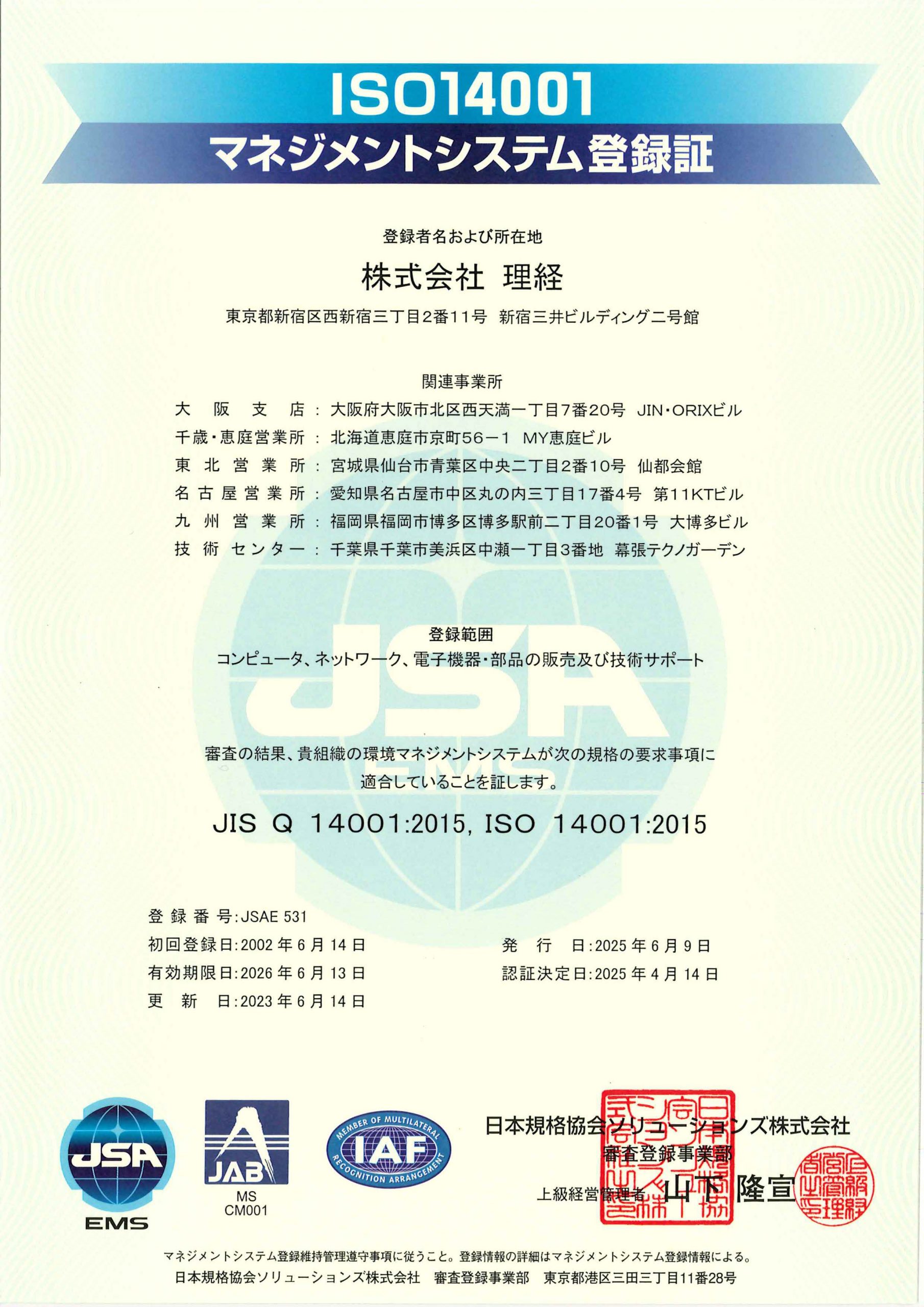 株式会社理経は、情報通信機器、電子部品の販売、それらに付帯するサービス活動を通じて地球環境の保全に努めるため、環境マネジメントシステムを構築し、継続的な改善を図ります。