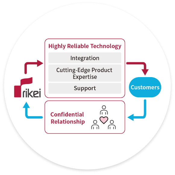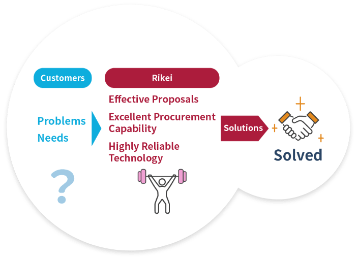 Rikei’s definition of a “Technical Trading Company” is one that provides solutions that added “technical” value responding to customers’ needs and solve their problems as well as products and instruments purchased from manufacturers and additionally, has highly reliable technologies that support in maintenance and operation.
