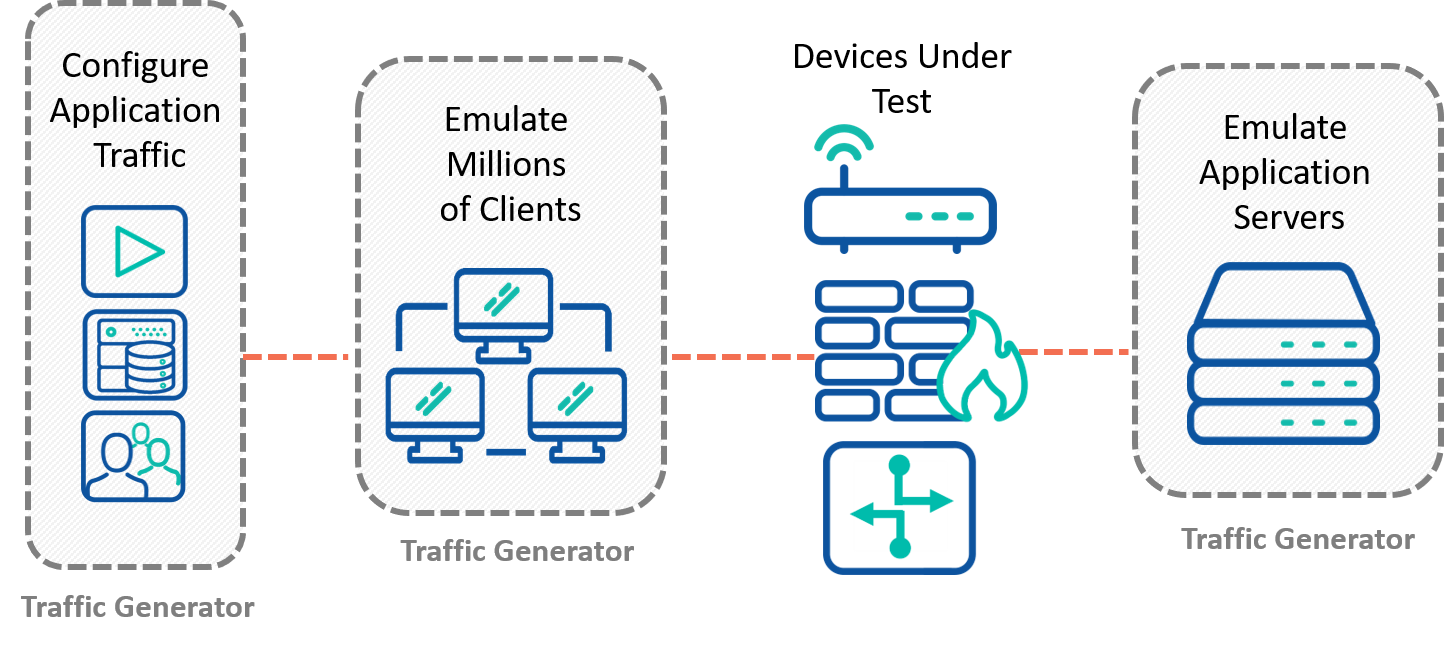 Netropy Traffic Generation can easily simulates situations where thousands of users flock to a site, enabling actual performance to be verified. To evaluate network and device performance, it can create several thousand network clients. It reproduces communications between an application and a server and evaluates the system’s communications capabilities. For example, it can evaluate the capabilities of a firewall when traffic is simulated, simulate the processing of a large volume of traffic with a VPN device, evaluate SD-WAN controllers, verify SD-WAN setups and configurations, and optimize SD-WAN implementation, etc. 1