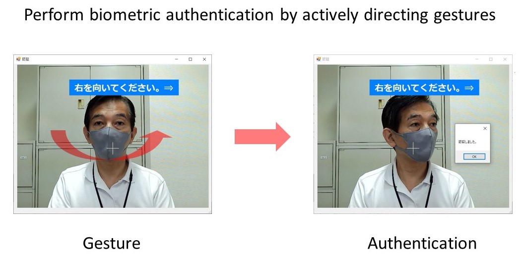 Proprietary gesture authentication prevents spoofing authentication, such as holding up a photo or video on a tablet. In addition, gesture authentication is performed at a high speed in order to reliably make a decision within a predetermined time period, as compared with AI authentication, which requires a certain amount of time for biometric determination.