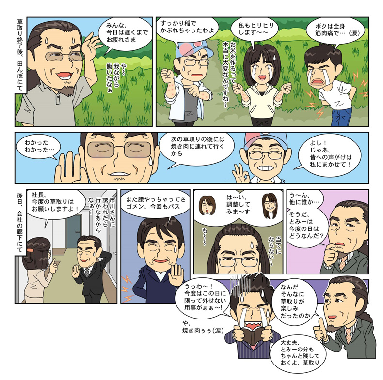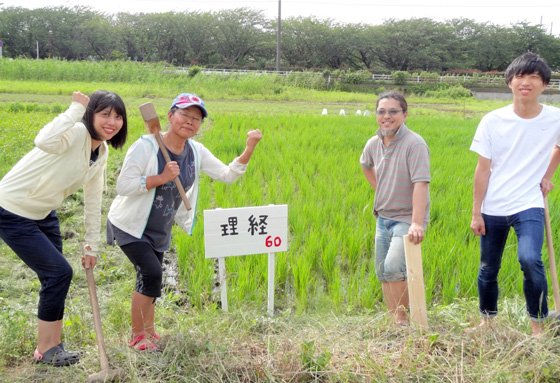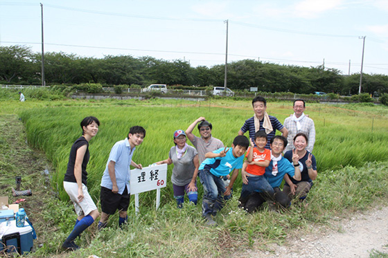1年を通してものづくりをしようと、リーダーの「まるさん」、協力者として手を挙げてくれた「しげおさん」、「市川さん」と共に理経社員とその家族、そして「いさか社長」までを巻き込み始まった「稲作体験」。