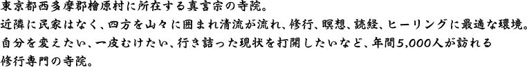 東京都西多摩郡檜原村に所在する真言宗の寺院。近隣に民家はなく、四方を山々に囲まれ清流が流れ、修行、瞑想、読経、ヒーリングに最適な環境。自分を変えたい、一皮むけたい、行き詰った現状を打開したいなど、年間5,000人が訪れる修行専門の寺院。