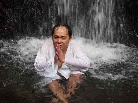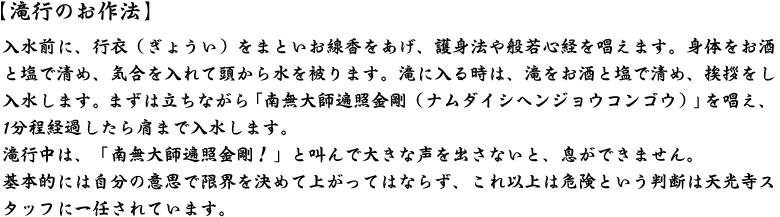 【滝行のお作法】入水前に、行衣(ぎょうい)をまといお線香をあげ、護身法や般若心経を唱えます。身体をお酒と塩で清め、気合を入れて頭から水を被ります。滝に入る時は、滝をお酒と塩で清め、挨拶し入水します。まずは立ちながら「南無大師遍照金剛(ナムダイシヘンジョウコンゴウ)」を唱え、1分程経過したら肩まで入水します。滝行中は、「南無大師遍照金剛!」と叫んで大きな声を出さないと、息ができません。基本的には自分の意思で限界を決めて上がってはならず、これ以上は危険という判断は天光寺スタッフに一任されています。