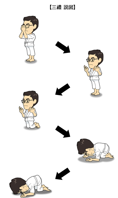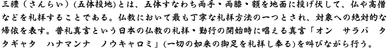 三禮(さんらい)(五体投地)とは、五体すなわち両手・両膝・額を地面に投げ伏して、仏や高僧などを礼拝することである。仏教において最も丁寧な礼拝方法の一つとされ、対象への絶対的な帰依を表す。普礼真言という日本の仏教の礼拝・勤行の開始時に唱える真言「オン サラバ タタギャタ ハナマンナ ノウキャロミ」(一切の如来の御足を礼拝し奉る)を叫びながら行う。