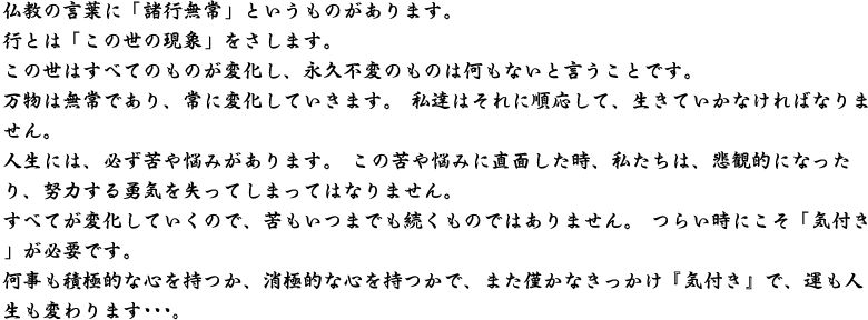 仏教の言葉に「諸行無常」というものがあります。行とは「この世の現象」をさします。この世はすべてのものが変化し、永久不変のものは何もないと言うことです。万物は無常であり、常に変化していきます。 私達はそれに順応して、生きていかなければなりません。人生には、必ず苦や悩みがあります。 この苦や悩みに直面した時、私たちは、悲観的になったり、努力する勇気を失ってしまってはなりません。すべてが変化していくので、苦もいつまでも続くものではありません。 つらい時にこそ「気付き」が必要です。何事も積極的な心を持つか、消極的な心を持つかで、また僅かなきっかけ『気付き』で、運も人生も変わります・・・。