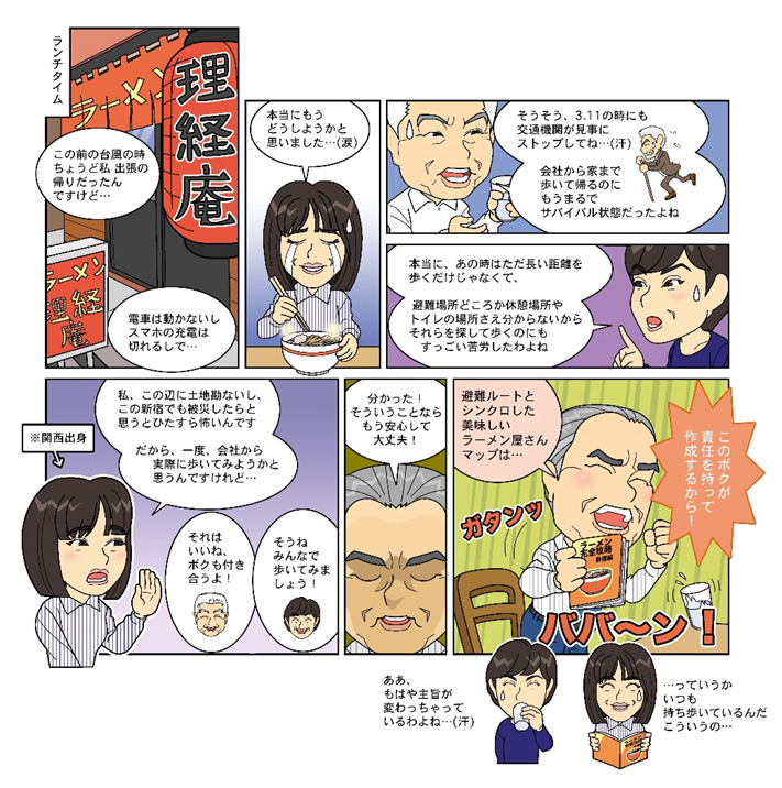 この日のために、「東京防災」を買いました!災害時に必要な情報が載っているんですよ。例えば、コンビニは地域の災害時帰宅支援ステーションになるのですが、対象店舗にはこんなステッカーが貼ってあったりとか!