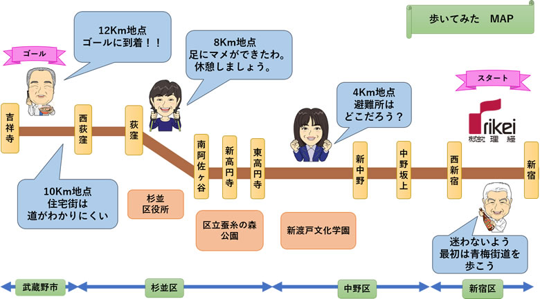 職場など、自宅から離れた都心で被災すると、交通網の復旧に時間を要し、帰宅が困難になることが予想されます。2011年3月11日の東日本大震災でも、帰宅するのにたいへんな思いをされた方も多いのではないでしょうか。関東大震災級の大地震はいつ起こるかもしれないとも言われています。いざというときのために、私たちチャレンジ企画班は、実際に新宿から自宅方面へ歩いてみることにしました!とはいえ、自宅までは人によっては数十キロあり、いきなり自宅まで歩くのは体力がもつか心配。。。今回は新宿駅と自宅の間に位置する吉祥寺駅を目指して歩くことに。チャレンジの結果はいかに?