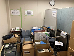 会議室に産業廃棄物を集め、4回にわたり廃棄しました。最後はパーティションの高さまでごみの山になりました。