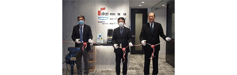新事務所のオープンを祝し、開所式を行いました。理経グループ3人の社長が並び、記念にテープカットを行いました。当日、テレワークの社員はオンラインで参加しました。