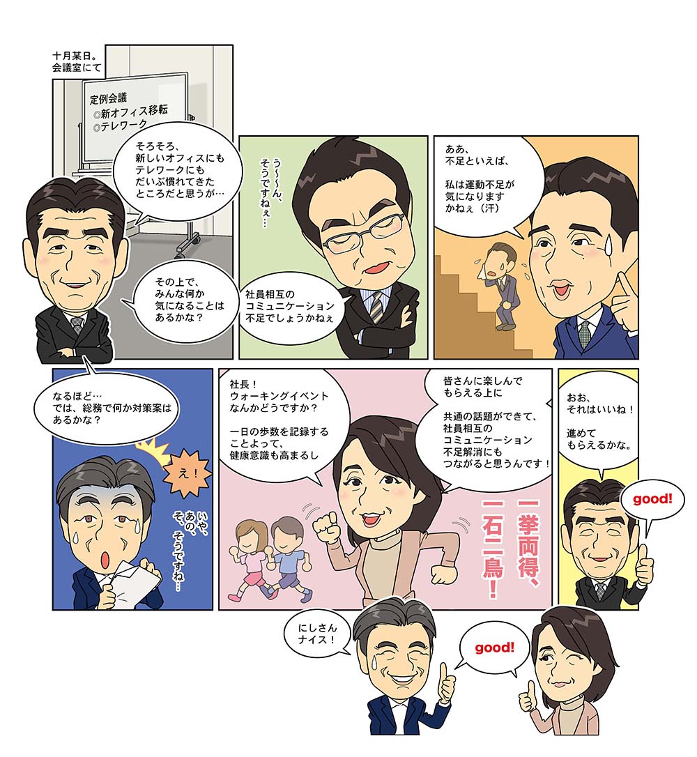 - 運動習慣をつけるには、こまめに記録して見える化して、改善していくことが大事ですね。忘れてしまいがちなので、社内の目立つ場所にお知らせを掲示したり、リマインドもしてみましょうか。社長!皆さんに楽しんでもらうために、ちょっとしたものでいいので、上位入賞した人への賞品や、参加賞を手配してみるのはどうでしょうか?社用のETCのポイントを利用したり、カンパをしてもらったり…。