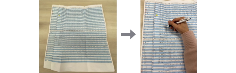 社内に下の写真のような紙の一覧表を設置して、参加者には出社した日にスマートフォンアプリなどで計測した一日の歩数を記入していってもらうのはいかがでしょうか?個人戦とチーム戦(4人一組)を設けて、それぞれ競い合ってもらおうと思っています!