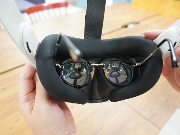 スタッフA:メガネをしたままVRヘッドセットを装着することも可能です。ただ、メガネを押し付けられる様な圧迫感があり、鼻に跡が残りそう。激しい動きはNGで、場合によってはメガネレンズの反射が気になるかもしれません。また、大きめのメガネフレームだとヘッドセット内部の硬いプラスチックとぶつかるかも、と思いました。