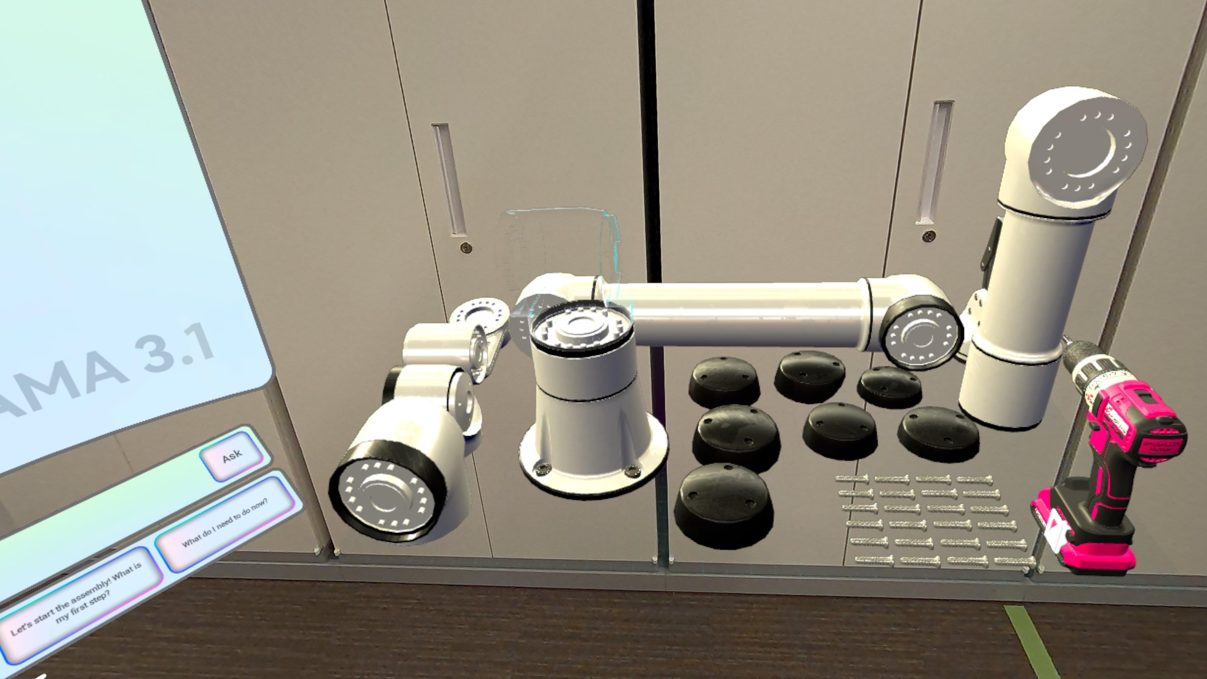 体験時、スタッフAが見ていたコンテンツは、ロボットアームの組み立てなどをMR上で行えるもの。製造設計に活用され、物理モックアップの必要性を大幅に減らします。