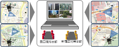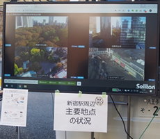 新宿駅周辺地域の被害状況の把握のため、西口エリア高層ビル群の広域避難所に指定されている新宿中央公園をはじめとする三地点でドローンを飛行させ、さらに定点カメラ一台で撮影されたリアルタイム映像を、工学院大学に設置されている新宿駅周辺防災対策協議会の西口現地本部、および新宿区役所の災害対策本部に提供しました。また、現地本部などから発信する情報をもとに、ドローンに搭載したスピーカーを通じて多言語の情報伝達テストやWEBシステムによる滞留者への情報提供を行いました。