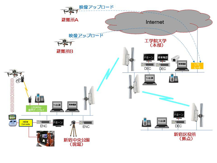 実証実験では、ドローンで撮影された映像を伝送するために、理経が取り扱う4.9GHz帯の無線機を使用し、新宿中央公園⇔工学院大学⇔新宿区役所の拠点間を長距離無線通信で結び、災害情報を共有する自営のシステムを構築しました。
