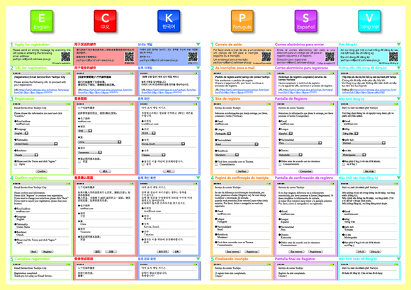 あらかじめ住民が登録した携帯端末やPCのメールアドレスに、市が配信する「八千代市情報メール(災害情報、避難所設置情報など)」を多言語(英語・中国語・韓国語・スペイン語・ポルトガル語・ベトナム語)で配信します。