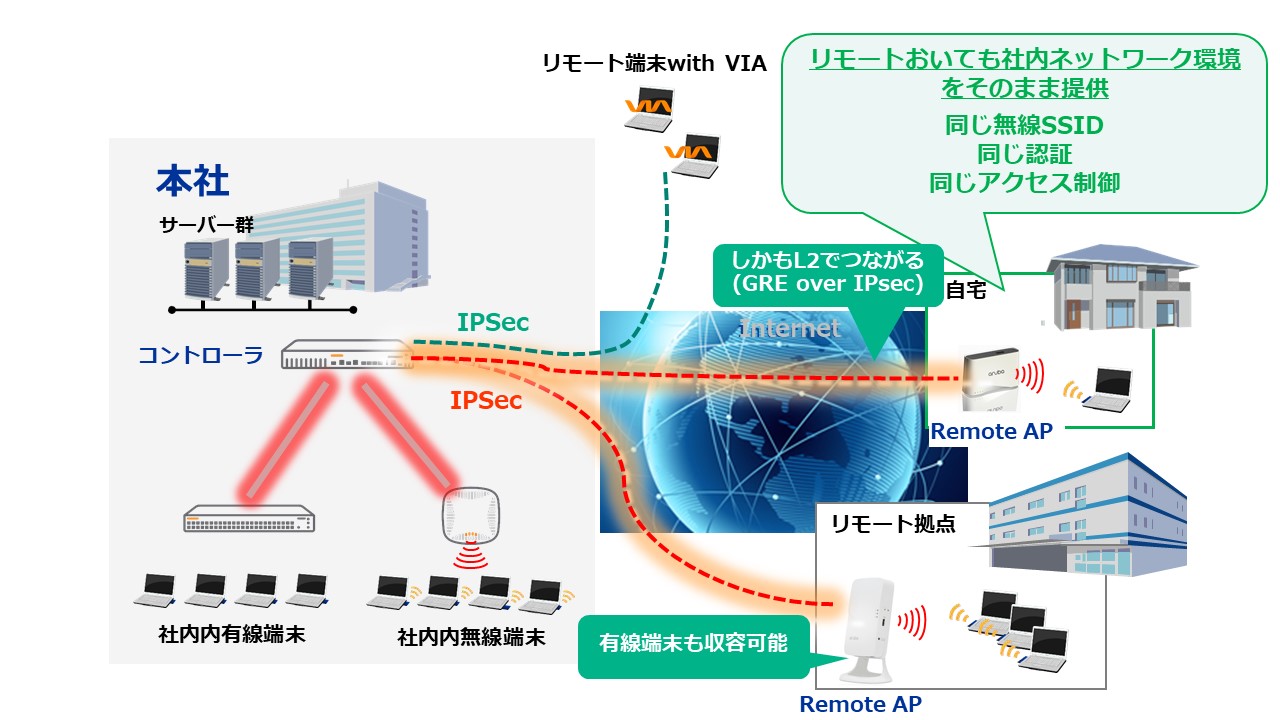 ・リモート(自宅やブランチオフィス)においても、社内ネットワーク環境をそのまま提供(同じSSID、同じ認証、同じアクセス制御)
