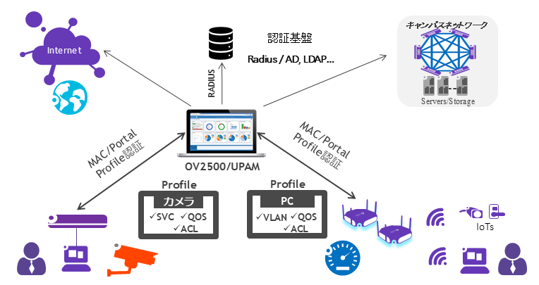 オフィス・キャンパス内外に設置可能な各種アクセスポイントや、それらを集中管理するコントローラをオンプレミス・クラウドともにラインアップしており、有線(*)と無線を統合したIPネットワーキングを構築できます。