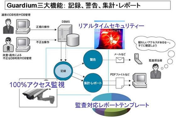 各データベース毎の適用パッチレベル、パスワード変更履歴、権限の割当てなどに関する脆弱な設定や、データベースへのアクセスログからユーザの振舞いを定期的にチェックする機能 |