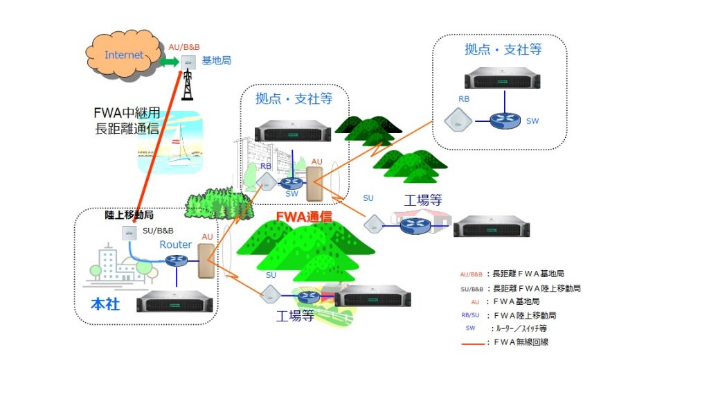 当社の長距離無線LAN(FWA)システムとの組み合わせによる「拠点間有線ネットワーク環境のバックアップ」も可能です。
