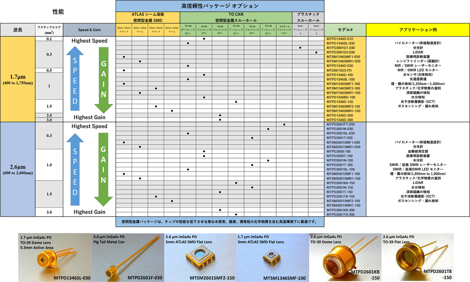 感度波長範囲は600 – 1,750nmと880nm – 2,600nmの2種類、受光面やパッケージタイプも複数用意しております。