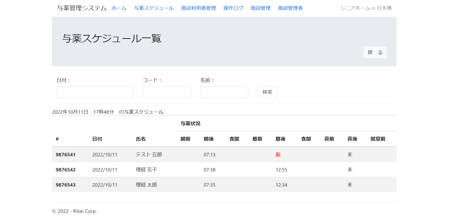 服薬介助動作(いつ、だれが、だれに、何を)を管理ツールから確認し、出力も可能で介護記録への転記や他の介護ソリューションとのデータ連携も可能 - 分包情報との自動連携