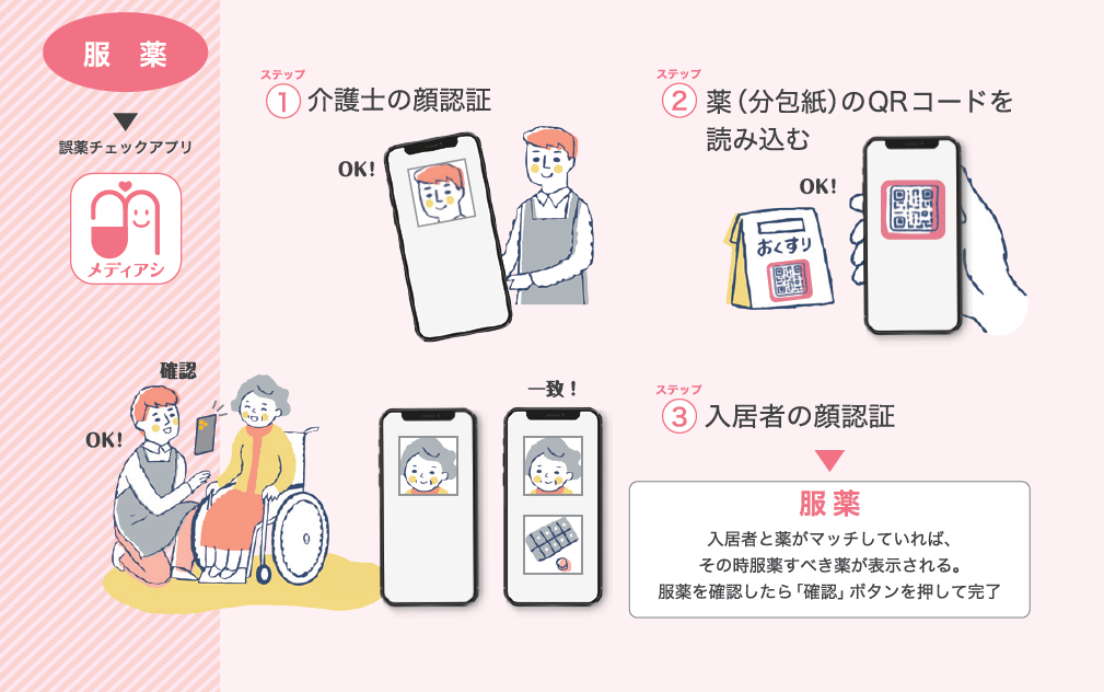 介護士(顔)→薬(QRコード)→入居者(顔)の認証のみでスピーディーにチェック可能 - ヒューマンエラー防止
