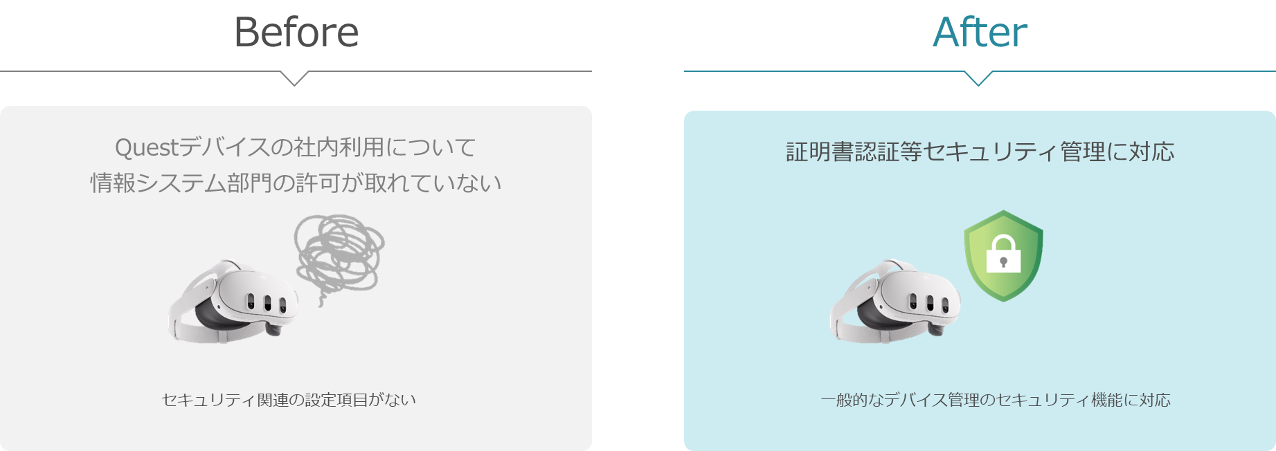 Meta Questデバイスを組織内でより安全かつ快適に利用するため、複数デバイスを一括コントロールおよびモニタリングし、セキュリティ基準や要件を満たすように設定することが可能です。