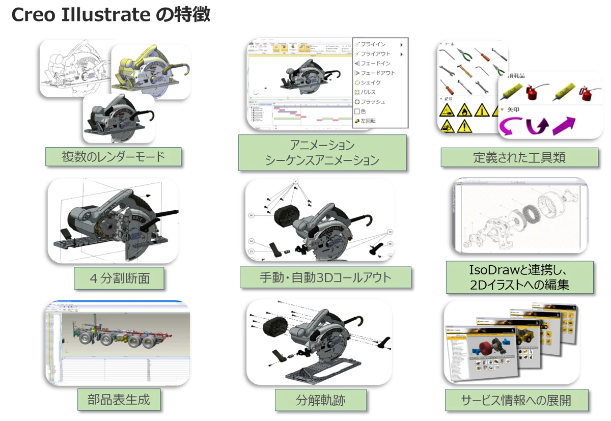 Creo Illustrate は、CAD データを再利用して複雑なサービス情報を簡単かつ正確に 伝達できる、アニメーション効果の付いた対話形式の 3D テクニカルイラストレーション(組み立て指示書やサービスマニュアルなど)を生成するPTC社のツールです。