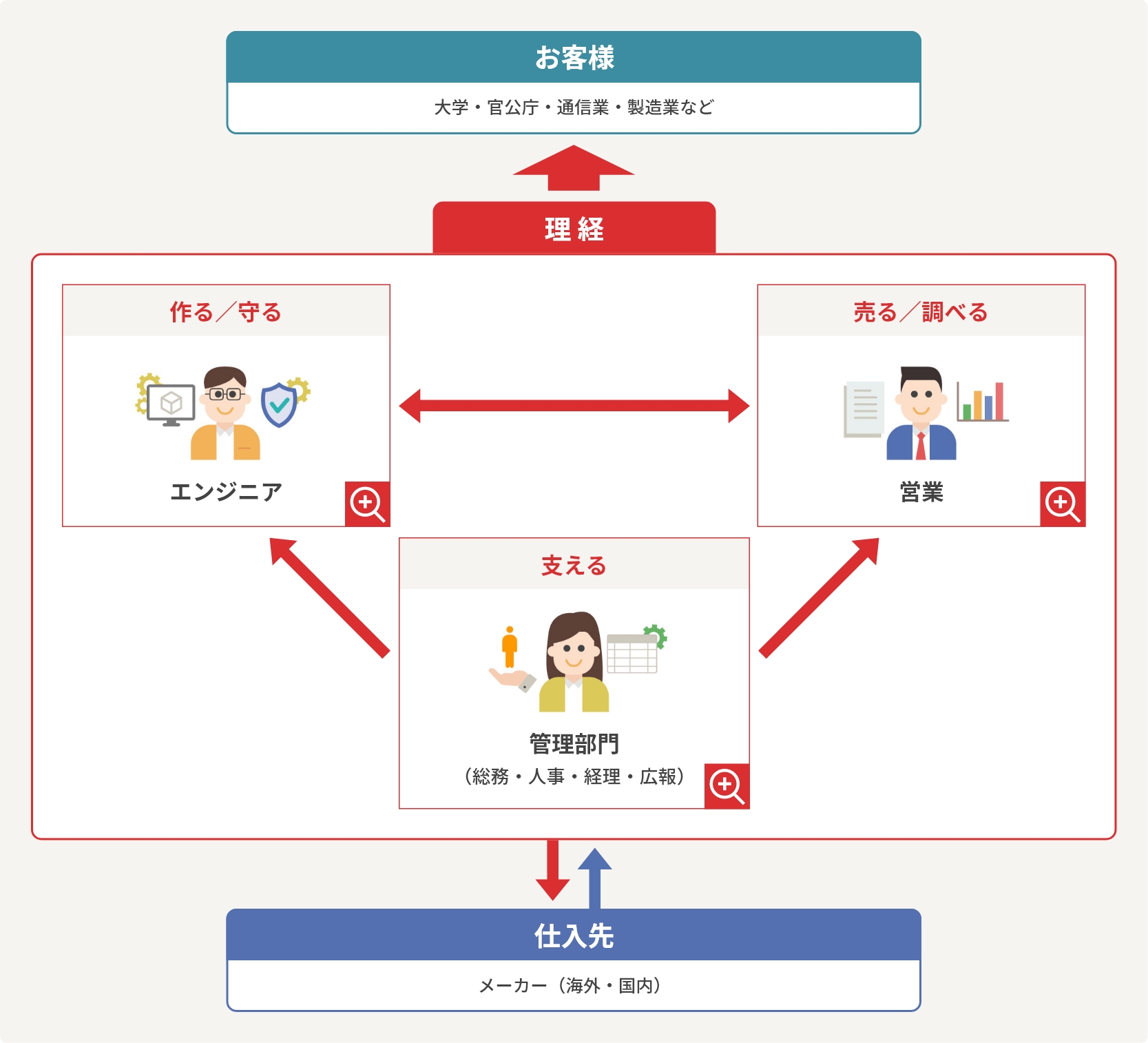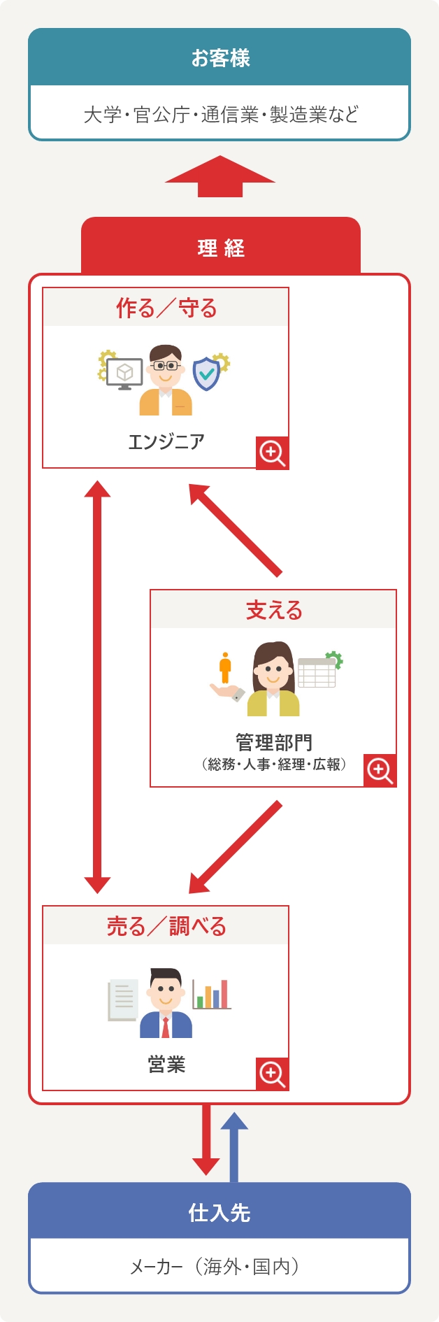 作る/守る エンジニア 支える 管理部門(総務・人事・経理・広報) 売る/調べる 営業 作る/守る エンジニア 支える 管理部門(総務・人事・経理・広報) 売る/調べる 営業